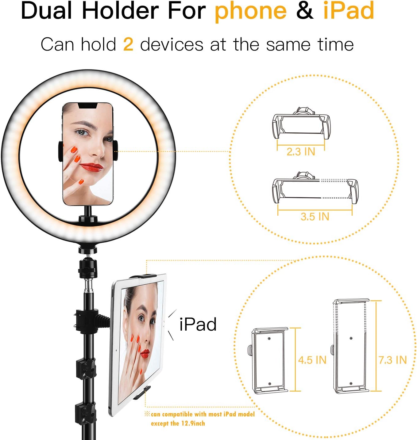 • Soporte doble para teléfono: la versión mejorada del anillo de luz LED JACKYLED es diferente de otras. Tenemos un diseño único de doble soporte, y especialmente hecho un soporte adecuado para iPad, que puede contener 2 dispositivos al mismo tiempo. Soportes para teléfono también compatibles con la mayoría de los teléfonos inteligentes. (Nota: el soporte no es compatible con iPad Pro 12.9).