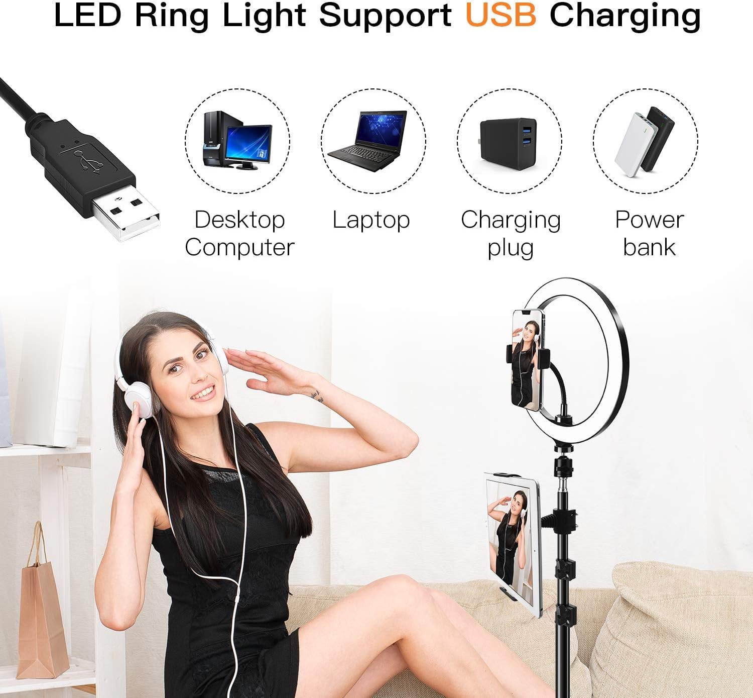 1 X 10” Ring Light with a USB cable; 1 X Phone Holder; 1 X Tablet Holder; 1 X Tripod Stand; 1 X Tripod Head Ball ; 1 X Bluetooth Remote Shutter; 1 X User Manual